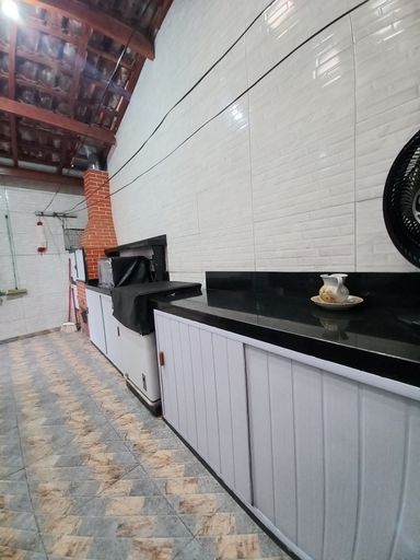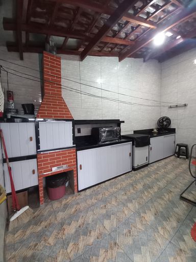 Casa com 2 dormitórios, cozinha planejada, sala, banheiro social, área de serviço e espaço com churrasqueira.